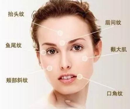 BOTOX主要解决抬头纹、川字纹、眼角鱼尾纹、鼻背皱纹等各种动力性皱纹: